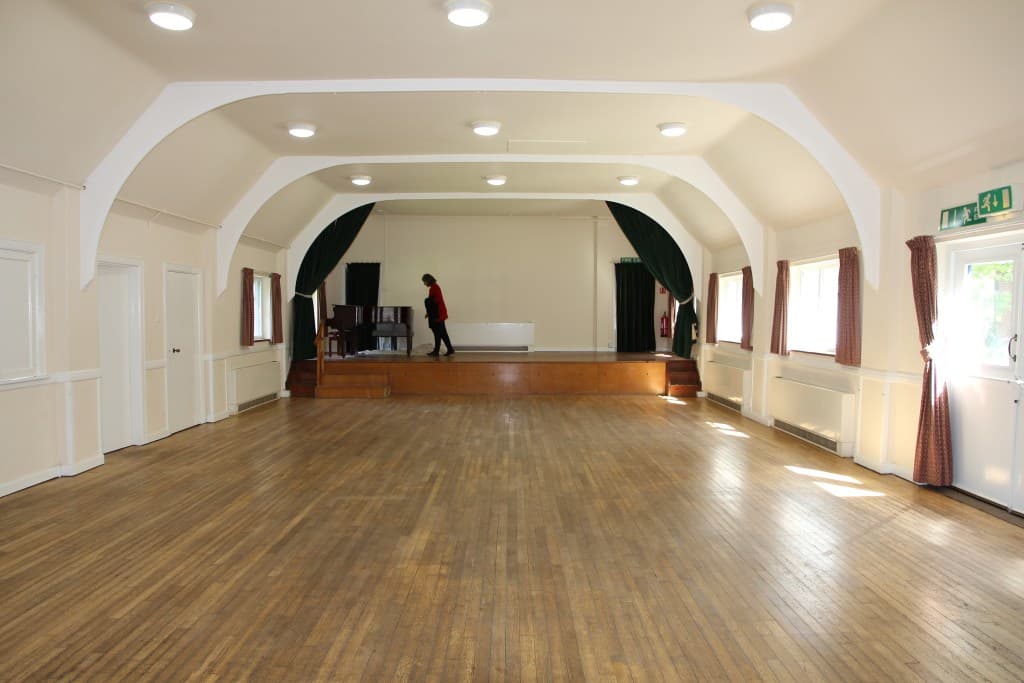 The hall can hold 120 people. It is a well-maintained, light, open and flexible space, approximately 13 x 8 metres, with a wooden floor. At one end of the hall there is a raised and curtained stage with a baby grand piano. It is particularly suitable for children’s parties, wedding receptions, exhibitions and displays, large meetings, dance, exercise and other activities.