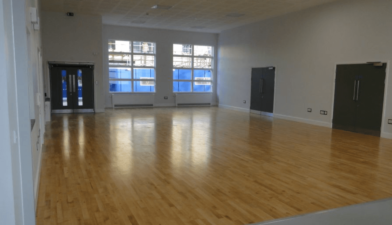 The main hall is 125 square metres with a sprung wooden floor ideal for dance and exercise, floor to ceiling windows and adjustable blinds. The main hall can be booked with the kitchen. For more space, include the meeting room or meeting room and lounge in your booking request.